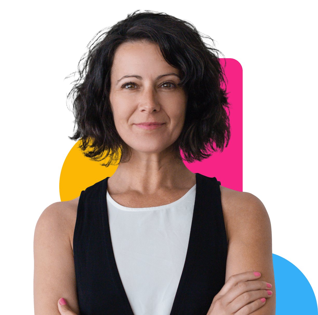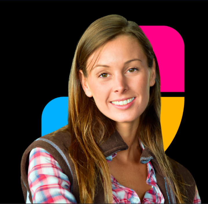 Jeune femme devant un cercle jaune avec la tête couverte souriant à la caméra.